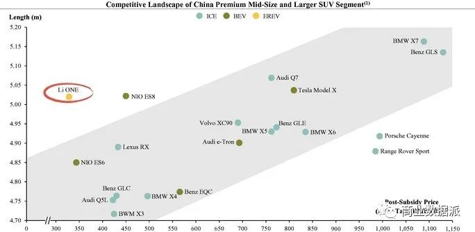 而在SUV市场中,理想汽车选择做增程式混合动力的原因有二,一个是可以摆脱里程焦虑;二是纯电动车的成本高,主要是锂电池太贵。下图是理想汽车给自己的定位。