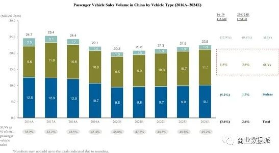 根据CIC报告,从2016年到2019年,SUV销量以1.5%的复合年增长率增长,渗透率从38.9%增加到45.4%。从2020年到2024年,SUV的销量预计将继续以3.9%的复合年增长率增长,到2024年将达到49.2%的渗透率。 下图显示了上述期间按车型划分的中国乘用车销量。