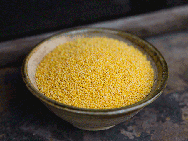 米粒圆润饱满、金黄鲜亮有光泽,不用凑太近,就能闻到小米特有的浓郁谷香。
