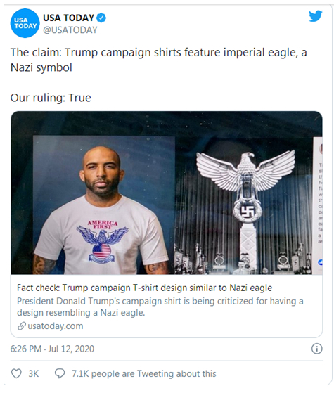 《今日美国报》12日先是发推,言辞肯定地写道:“声称:特朗普的竞选衬衫上印有帝国鹰,这是纳粹的标志。我们的裁定:真的。”↓