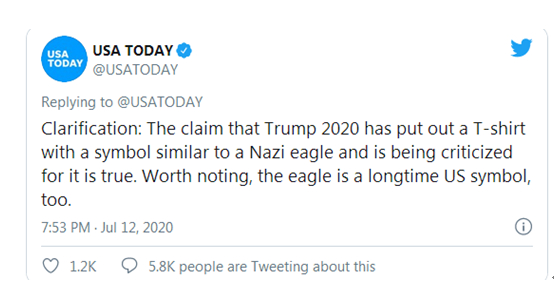 随后,《今日美国报》再次作出说明。“澄清:有关特朗普2020年(竞选活动)推出了一件带有类似纳粹鹰标志的T恤,并因此受到批评的说法是真的。值得注意的是,鹰也是美国长久以来的象征。”↓
