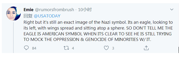 不过,也有网友认同这是“纳粹标志”的说法:“没错,但它(特朗普竞选T恤上的图案)仍然是纳粹的标志。那是一只鹰,面朝其左,张开翅膀坐在一个球体上。所以,当鹰清楚地看到他(特朗普)仍然试图嘲笑对少数民族的压迫和种族主义行为时,不要告诉我鹰是美国的象征。”↓