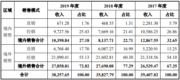 此外,根据招股书披露,2017年至2019 年,康泰医学对美国收入占外销业务收入比例分别为 31.37%、29.25% 和 25.30%,各国收入中美国业务收入占公司外销业务收入比例最高。同时,招股书第21页也披露了公司的外销收入占公司全年收入来源7成左右的份额。