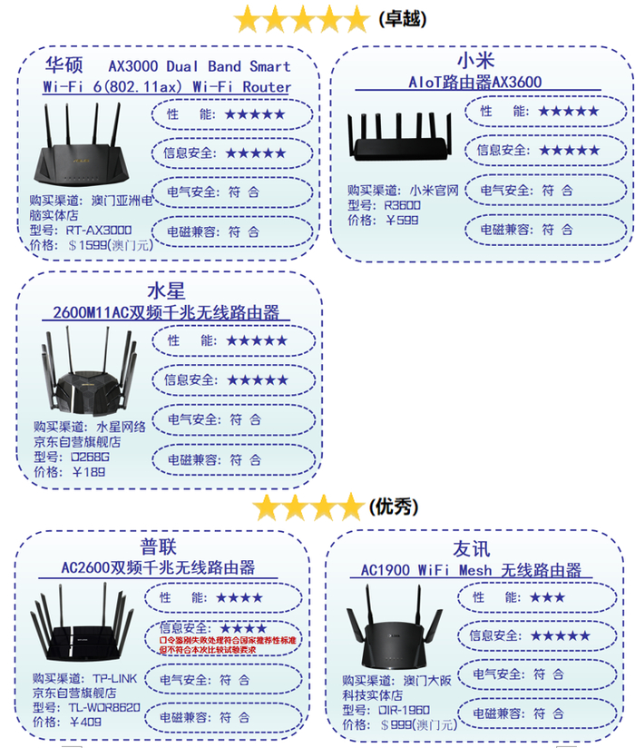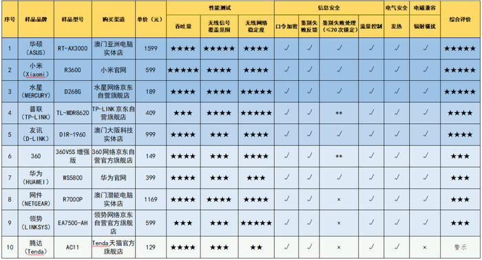 ▲10款样品,涉及品牌有:小米、普联、华为、领势、网件、华硕、水星、腾达、360、友讯