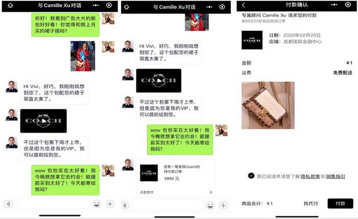 对顾客而言,则不必额外下载WeClient APP,通过Coach微信小程序的“专属顾问”功能,即可轻松与专属顾问保持密切联系,随时随地享受非凡购物体验。