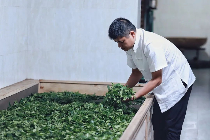萎凋经过室内和室外增温增氧,使茶叶均匀散失适量水分,叶质变软,便于成条,为揉捻工序创造物理条件。