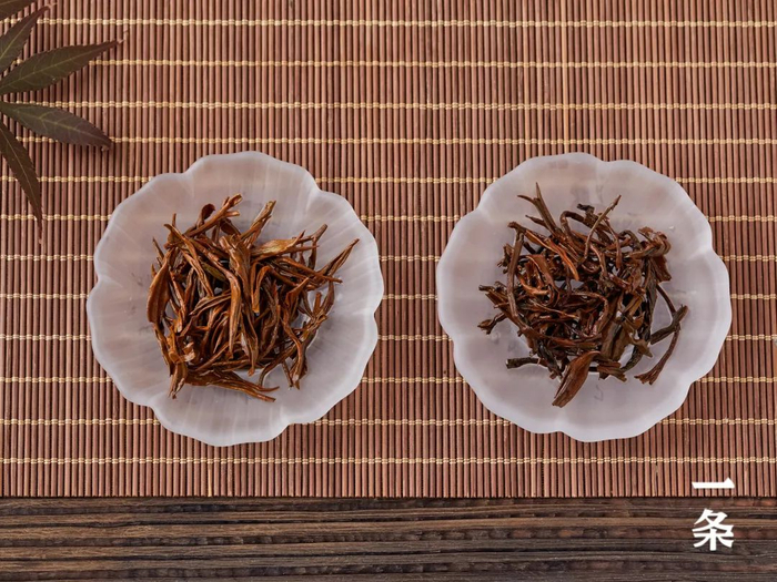 条索的外形更粗,叶展更宽,采摘时间较晚,发酵程度最高,整体颜色“半黄九半黑”。