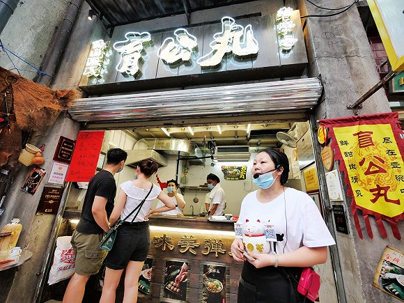 穿过入口处,一楼是类似于长沙项目的“永远街”,汇集了非物质文化遗产的广州街头小吃,包括八珍煎饺、阿婆牛杂、荔银肠粉、恩宁刘福记云吞面、盲公丸以及信行丰炖品皇等。此外,广州超级文和友还覆盖了美容美发、文具店、纹身店、酒吧等业态可体验。