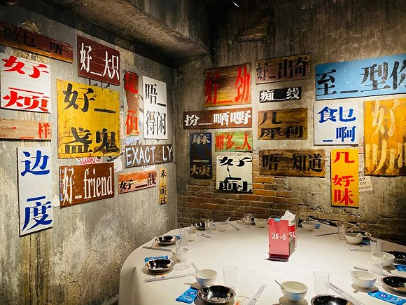 广州超级文和友同样在设计上讲求细节,上下楼转角处和墙壁上“呢边埋单”“行呢边落”“鬼咁正”“超顶瘾”等大小张贴,真个空间内满是从各处收集回来的建筑旧物与日常物品。还有故意做旧的土味砖瓦房、毛坯墙壁、窗口铁栏杆晾晒着几件衣服等等,试图还原一个熟悉又已经离我们远去的生活场所。