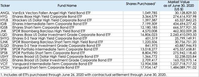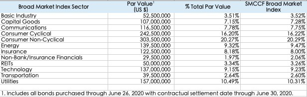 最初,SMCCF的结构是持有两种投资,即“合格的个别公司债券”和“合格的公司债券ETF”。6月16日,美联储推出了第三类企业债投资方式,即“合格的广泛公司债市场指数债券”(Eligible Broad Market Index Bonds),发行人符合债券评级要求资格,即必须在2020年3月22日之前被评为投资级别,并且在美联储用该工具购买之时的评级至少在BB- / Ba3以上。