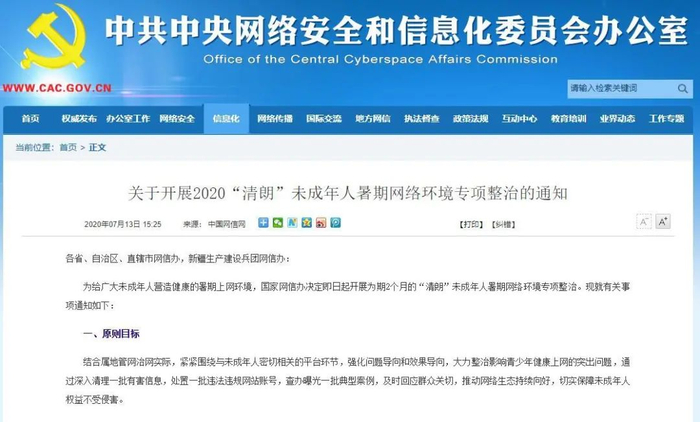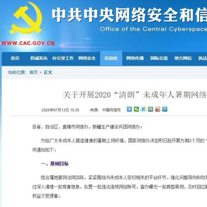 为给广大未成年人营造健康的暑期上网环境,国家网信办决定即日起开展为期2个月的“清朗”未成年人暑期网络环境专项整治。现就有关事项通知如下:
