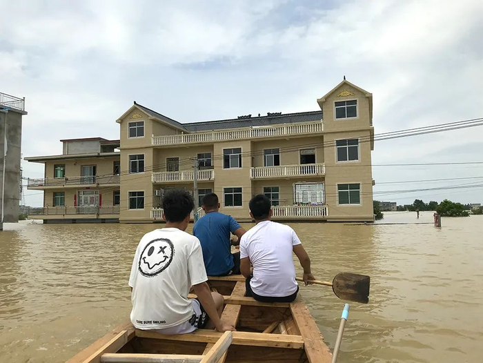木制龙舟长约十米,停靠在圩堤边。一家人划着木浆,缓缓向村里进发。沿途,他们要小心避开电线和树枝,农田、平屋、阡陌巷道全都不见了,露出水面的路灯被甩在身后。