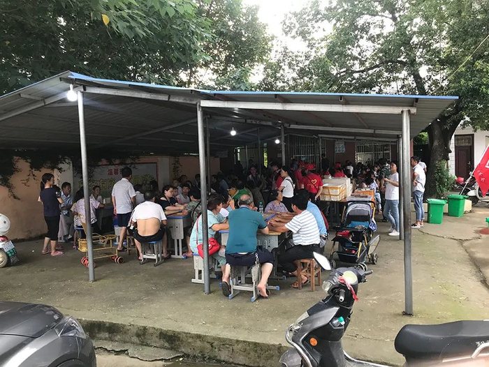 受灾群众聚集在桥头小学安置点大棚下,准备吃饭。