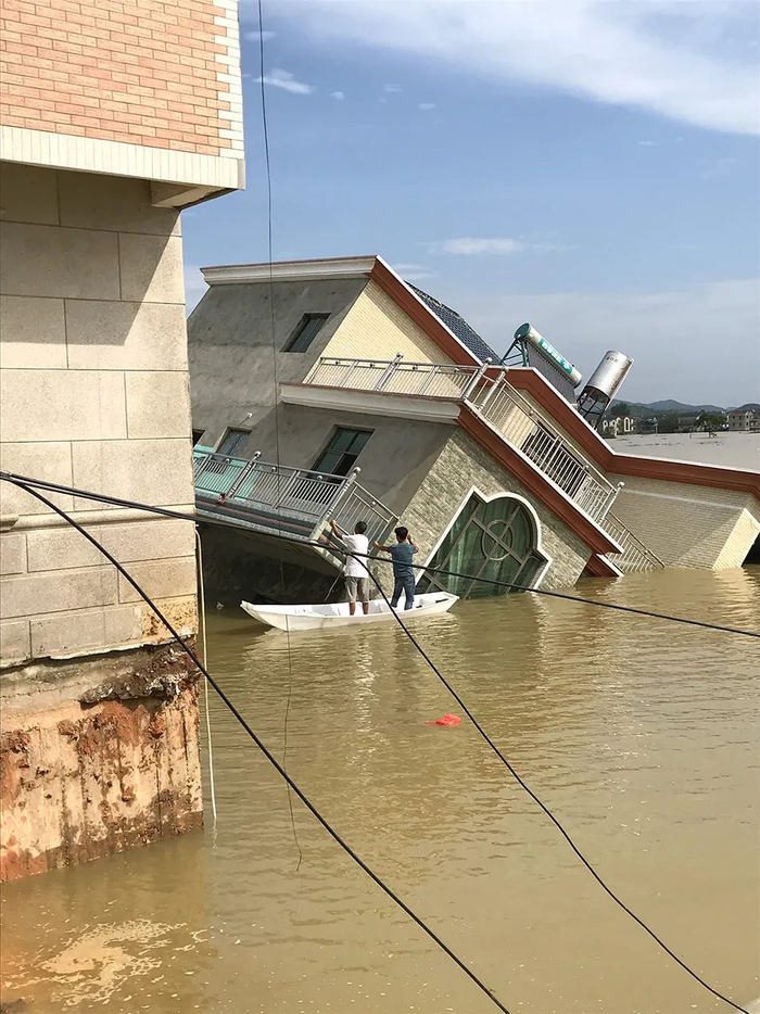 缺口洞开,洪水涌入得更猛烈了,陆续有两栋楼房和道路垮塌。接下来,是黄紫益的房子,在洪水的冲击下摇摇欲坠。