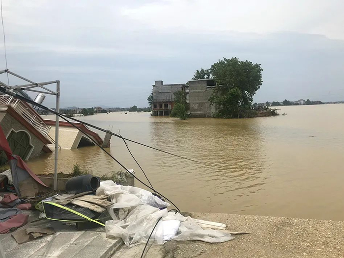 黄紫益和妻子女儿来到决堤处,他们家的房子已经被冲走,隔壁叔叔家的房子倾斜在水中