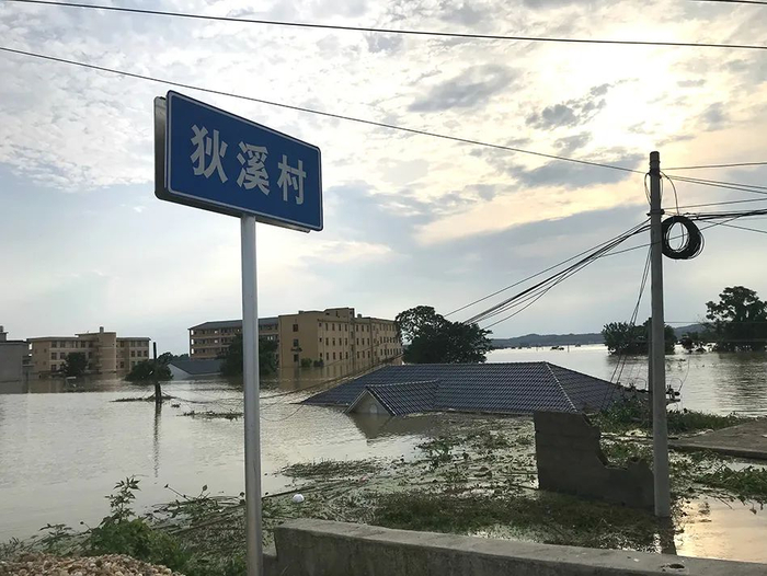 等到中午11、12点,源公村北侧的彭家湾突然发生决堤,浑浊的河水迅速由北向南、由西向东流入。村民们打着伞,站在高处,看着洪水吞没他们的农田,渐渐地,只有树冠的枝杈露出水面一角。