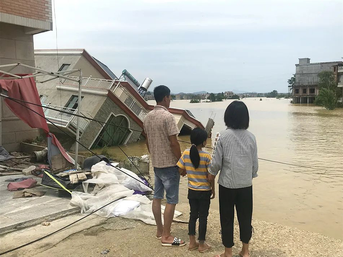 “快快快,房子要倒了”,黄来援焦急地喊楼上的妻子和孩子。妻子还没意识到外面的巨响是水声,直到她听到丈夫的呼喊,才仓促地跑上楼抓了一个包跑出来,里面装着她的身份证。