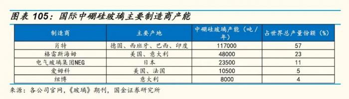 据悉,由于美国、欧洲、日本与俄罗斯均强制要求所有注射用制剂和生物制剂使用中性硼硅玻璃包装,国外医药行业已普遍使用中硼硅玻璃。根据国金证券,国际中鹏硅玻璃主要制造商有肖特、格蕾丝海顿、电器玻璃集团、爱姆特和纽博,产地主要分布在美国、意大利、日本等。