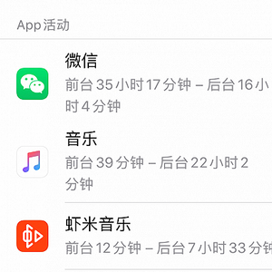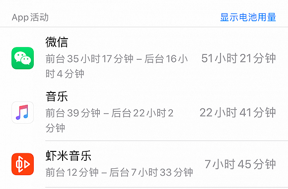 或许因为Apple Music用户并不多,并没有国内用户反映该问题。不过界面新闻记者经体验发现,国内Apple Music似乎也同样有后台频繁活跃的问题。在10天内,虾米音乐和Apple Music使用频率和时长相差无几的情况下,Apple Music的后台运行时长更长,达到22小时,虾米音乐则只有7.5小时。相比之下,最常用的微信后台运行时长为16小时。