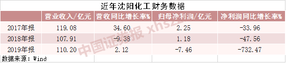 近年来,沈阳化工业绩持续下滑。2017-2019年,沈阳化工营收分别为119.08亿元、107.91亿元、110.2亿元;归母净利润为2.25亿元、1.18亿元、-7.46亿元。