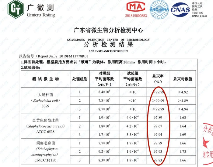 经过第三方专业机构检测,常见的大肠杆菌(易造成肠胃、尿道感染)、金黄色葡萄球菌(常见的引起食物中毒的致病菌)、须癣毛癣菌(易造成皮肤感染)等等,灭菌率为97.67-99.9%之间。