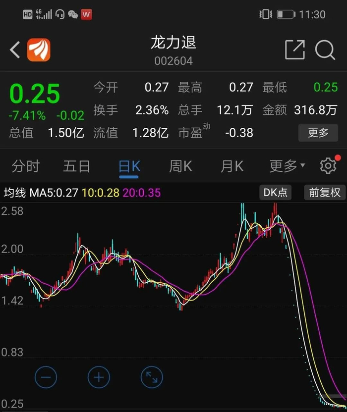 今天是龙力退在A股的最后一个交易日,其股价已不足3毛钱。