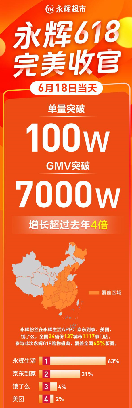 今年618期间,借助永辉生活以及京东到家、美团、饿了么等平台,永辉的“到家”业务已覆盖24个省137个城市共计1117家门店。6月18日当天,永辉“到家”业务GMV增长超过去年同期4倍,成为新的增长点。