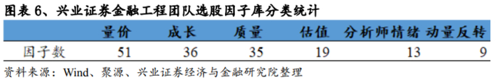利用上一章提到的方法,我们对当前兴业证券金融工程团队选股因子库中的六大类共163个因子在创业板指成份股内进行了单因子增强组合测试,测试区间是2010年12月31日到2020年6月30日。而后我们将对所有因子的表现进行归纳总结,确定创业板指增强策略所选因子和相应的因子权重。以下图表5给出了我们因子库中163个因子的分类情况和各类因子的数量: