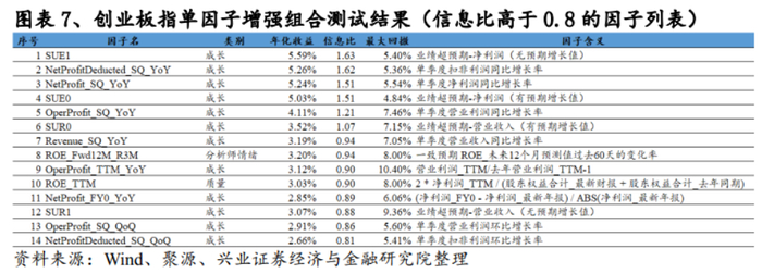 从上图可见,在我们考察的时间范围内,创业板指单因子增强组合信息比高于0.8的因子共有14个,其中成长因子12个,分析师情绪因子1个,质量因子1个。这符合我们的直观理解,即在创业板这样的新兴成长板块,应该最为注重公司成长性。