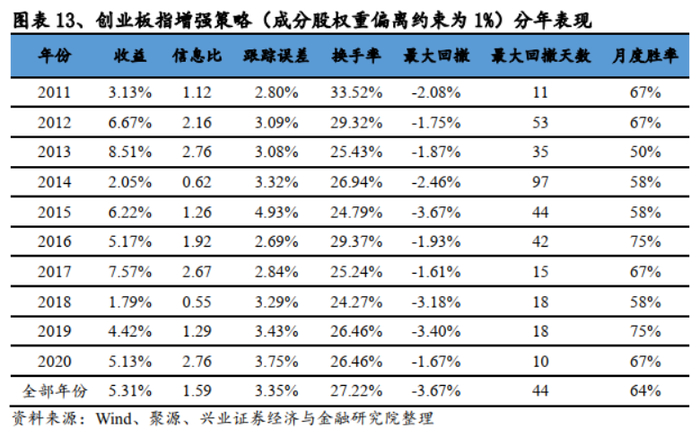 3、在我们最终的增强模型设定下,创业板指增强策略年化超额收益与信息比分别为7.26%与1.69,跟踪误差与最大回撤均控制在5%以内;今年以来,截至6月30日,该增强策略在4.69%的跟踪误差下,实现了8.70%的超额收益,表现十分亮眼。
