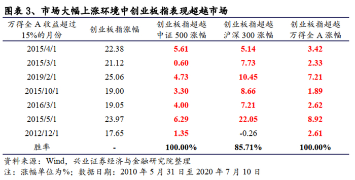 市场大涨中弹性强:当市场大幅上涨时,创业板指的涨幅往往超过其他市场指数。我们将万得全A涨幅超过15%的月份认为是A股的市场大幅上涨月份,从创业板指数基日(2010年5月31日)起至今的118个月度中,A股一共出现7个大幅上涨月份,其中创业板指涨幅超过中证500的有7次,超过沪深300的有6次,超过万得全A的有7次,胜率分别达到100%、85.71%、100%,可见在市场大幅上涨环境中创业板指业绩弹性更强。