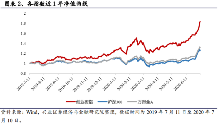 1、2020年2月14日,《再融资规则》修订正式落地,创业板指成分股中有近一半的公司可能符合新规则下的公开发行股票条件。2020年4月27日,中央全面深化改革委员会会议审议通过《创业板改革并试点注册制总体实施方案》。同日,证监会和深交所发布《创业板首次公开发行股票注册管理办法(试行)》等系列规则,标志着创业板注册制改革进入实施期;利好的政策刺激与宽松的货币环境也助推创业板指在2020年乘风破浪,截止7月10日的涨幅已达到54.52%,在各大宽基指数中表现极为亮眼。