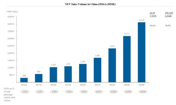 工信部于2019年12月发布的《新能源汽车产业发展计划(2021-2035)》确定了中国的目标销量:到2025年,新能源汽车的销量将占汽车总销量的25%。根据CIC报告,从2020年到2024年,新能源汽车的销量预计将继续以34.5%的复合年增长率增长。