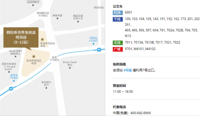 得此优势,新世界首家市内免税店“明洞店”就设置在地理位置优越的新世界百货8F-12F,与百货业务无缝接合,且提供了充足的客流量。