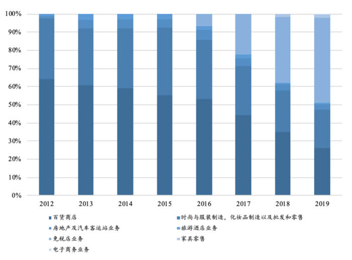 但截至到2019年,免税业务为新世界集团贡献了49.1%的销售收入和31.3%的毛利,百货商店所占收入比例在不断地减少。