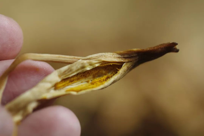 正常晒干的黄花菜,顶部会有稍稍发黑,是在熏蒸,晾晒过程中,糖份沉淀的原因,只有古法炮制的黄花菜才有的特征。