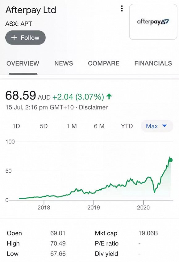 每个人2000澳元的上限,单笔1500澳元,和一个“先入优势”。仅此而已。在Afterpay 之后,还有几个公司依样画葫芦,有的甚至也已经上市了。但是Afterpay已经占尽了风头。另外一个上市公司就是:Zip Co (z1p AX),也有十亿美元市值。