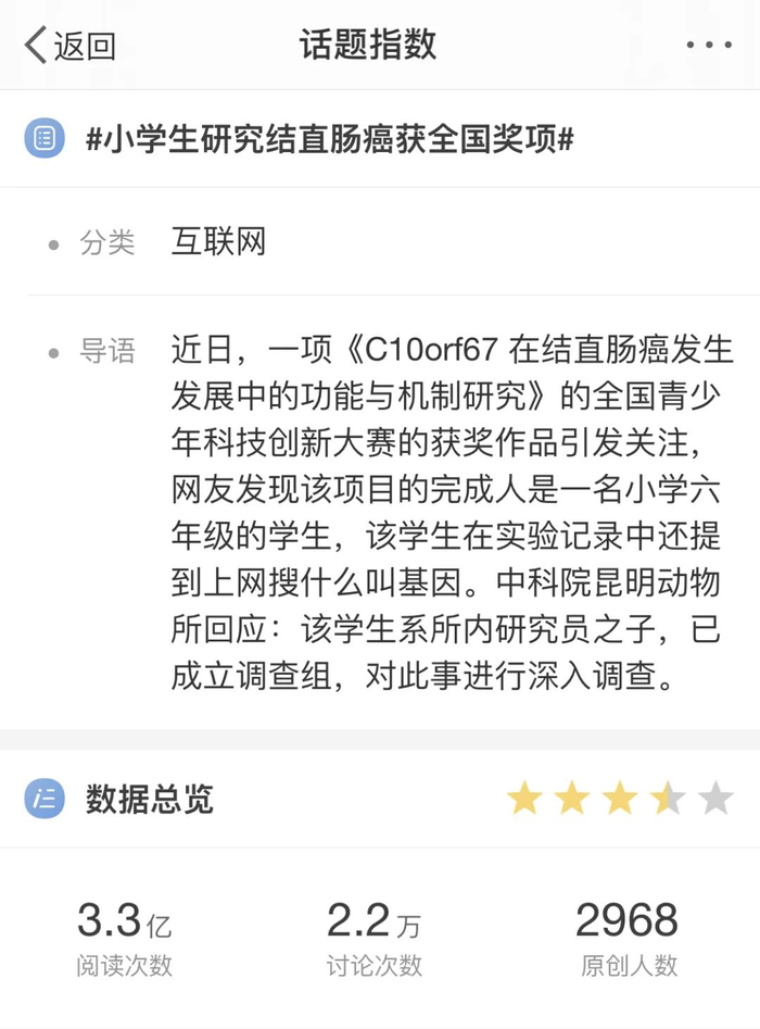 例如最近炒得沸沸扬扬的#小学生研究结直肠癌获全国奖项#,也同样可以用类似的方法论来解构。