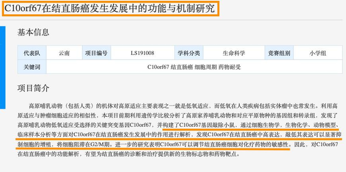 作出假设——因为高原哺乳动物(包括人类)的集体对高原适应的主要表现之一就是低氧适应,而低氧在人类疾病包括实体瘤中也常发生。根据高原适应和肿瘤细胞适应的相似性,高原哺乳动物低氧适应受选择的关键突变基因C10orf67可能会成为肿瘤细胞治疗的标志物和药物靶点。