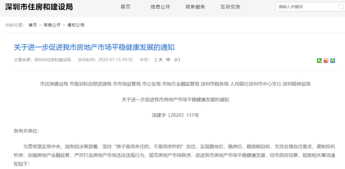 7月15日,深圳市住建局、市规自局、市市场监管局、市公安局、市地方金融监管局、市税务局、人民银行深圳市中心支行、深圳银保监局等8个部门联合发布《关于进一步促进我市房地产市场平稳健康发展的通知》。