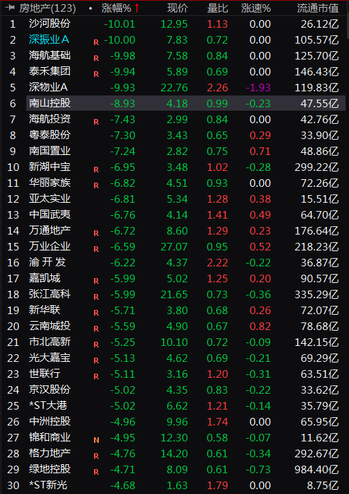 在政策公布后,深圳本地地产股全线杀跌,沙河股份、深振业A跌停,深物业A大跌逾9%,南山控股大跌近9%。