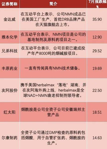 7月15日,“抗老神药”NMN概念大幅高开,截至收盘,金达威五连板,雅本化学两连板,科伦药业、苏盐井神、兄弟科技纷纷跟涨。