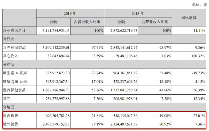 2019年,金达威实现营业收入31.92亿元,同期增长11.10%;归属上市公司股东的净利润4.51亿元,同比下降34.42%。对于净利润的下降,金达威解释称,主要系VB计提大额商誉和无形资产减值及维生素原料产品销售价格下降所致。