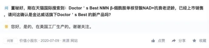 7月9日,金达威董秘曾在互动平台上表示,在美国工厂生产的Doctor's Best NMN β-烟酰胺单核苷酸NAD抗衰老逆龄(产品),已经上市销售。天猫旗舰店目前售价1599元/瓶。