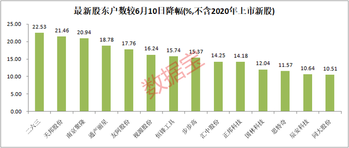 以最新股东户数与6月10日比较来看,19股筹码下降幅度超过10%,以上3只新股筹码下降幅度均超过55%,除此3股以外,二六三、天邦股份、南京聚隆3股筹码下降幅度均超过20%;通产丽星、友阿股份、视源股份等5股筹码下降幅度均超过15%。下降幅度低于2%的有汉宇集团、佳电股份、药石科技。