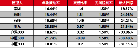 四家私募基本面状况不相上下,再来看看产品业绩。申九产品波动较大,但每次下跌之后恢复的速度较快,而且每年都取得了正收益;趣时的产品在2017年整体不适合成长风格的情况下也能取得较好的业绩,跟价值股投手相比丝毫不逊色;泰旸属于熊市能够大幅跑赢市场,而牛市基本能跟上市场涨幅的选手;石锋的产品则除了在2018年差强人意外,其余年份都十分优秀。