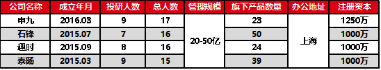 这四家私募了泰旸外,其他三家都在2015年股市大幅波动之后成立,但算到现在也都成立了4-5年。横向比较看,投研人数和总人数均差别不大,且管理规模目前大致都处于20-50亿这一档,其中石锋管理规模最大,也是产品数量最多的私募。全部都在上海办公,注册资本相差无几且都具备投顾资格。