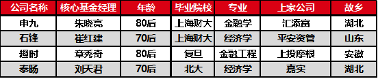 所以,我们不妨先从四位基金经理讲起,他们分别是趣时的章秀奇、泰旸的刘天君、石锋的崔红建和申九的朱晓亮。年龄均在35-45岁之间,崔红建年龄稍长,有17年的资本市场投研经历,朱晓亮年纪最轻,拥有13年证券投研经验。四位均毕业于国内名校,且均为硕士研究生,所学专业无论是金融还是经济都跟投资沾边。朱晓亮和刘天君都是湖北人,章秀奇是安徽人,崔红建是山东人。四位基金经理性格各异,朱晓亮内敛,刘天君热情,章秀奇慎思,崔红建淳朴。