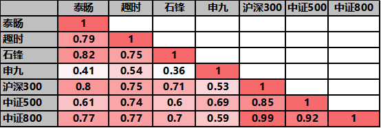 我们对几只产品的业绩做了相关性分析,结果显示,泰旸和石锋之间的相关系数比较高,为0.82,而申九跟其他几个产品的相关性都不高,跟石锋的相关系数最低,只有0.36。泰旸和石锋都跟沪深300指数的相关系数较高,分别是0.8和0.71,而申九与中证500的相关系数最高,趣时与中证800的相关系数相对较高。