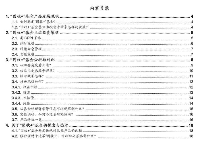 近年来随着无风险利率的下行,以余额宝为代表的货币基金7天年化破2,传统银行理财产品收益率大幅下降,居民理财需求亟需得到满足。“固收+”公募产品以长期稳健回报为目标,主要投资债券类资产,同时配置一定比例权益资产实现收益增强,开始备受市场关注。本文对“固收+”产品进行探讨,从策略维度出发,分析和对比基金的风格特点,并与其他绝对收益策略基金比较,同时从策略构建角度对银行理财“固收+“产品设计提出建议。